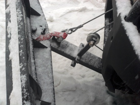 5. Натянуть трос через нижний ролик, продеть через верхний ролик и закрепить крюк держателю снегоотвала.